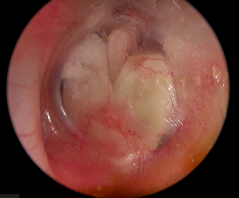 4. Posiciona o enxerto sob remanescente do tímpano, fechando totalmente o orifício. Existem várias técnicas; uma das comuns é a técnica “underlay” medial (colocar o enxerto por baixo da borda do tímpano), mas em casos específicos pode-se optar por outras técnicas. O endoscópio permite ao cirurgião posicionar com precisão o enxerto, observando todos os ângulos.